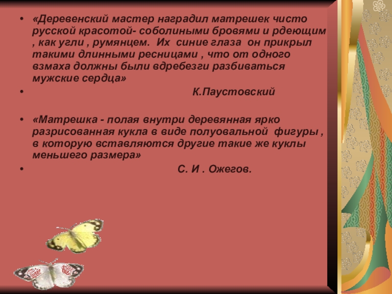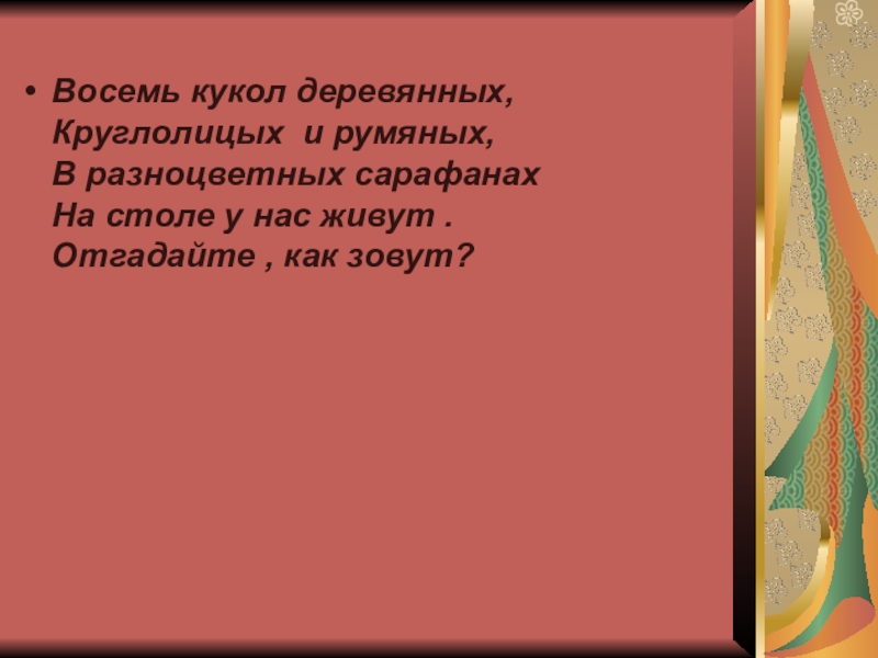 Восемь кукол деревянных, Круглолицых и румяных, В разноцветных сарафанах На столе у нас живут . Отгадайте , как зовут?