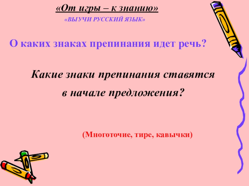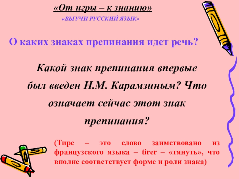 (Тире – это слово заимствовано из французского языка – tirer – «тянуть», что вполне соответствует форме и роли знака)