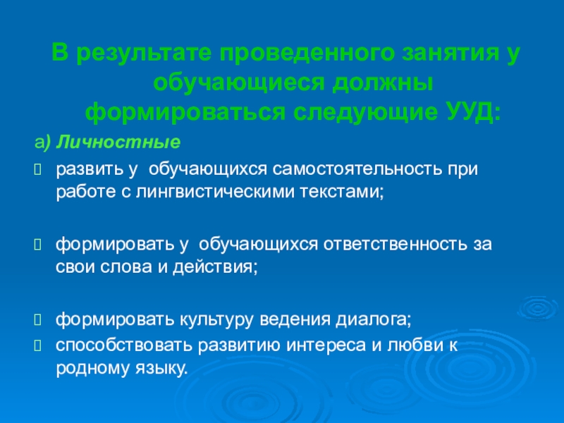 Слайд 9 В результате проведенного занятия у обучающиеся должны формироваться следующие УУД: