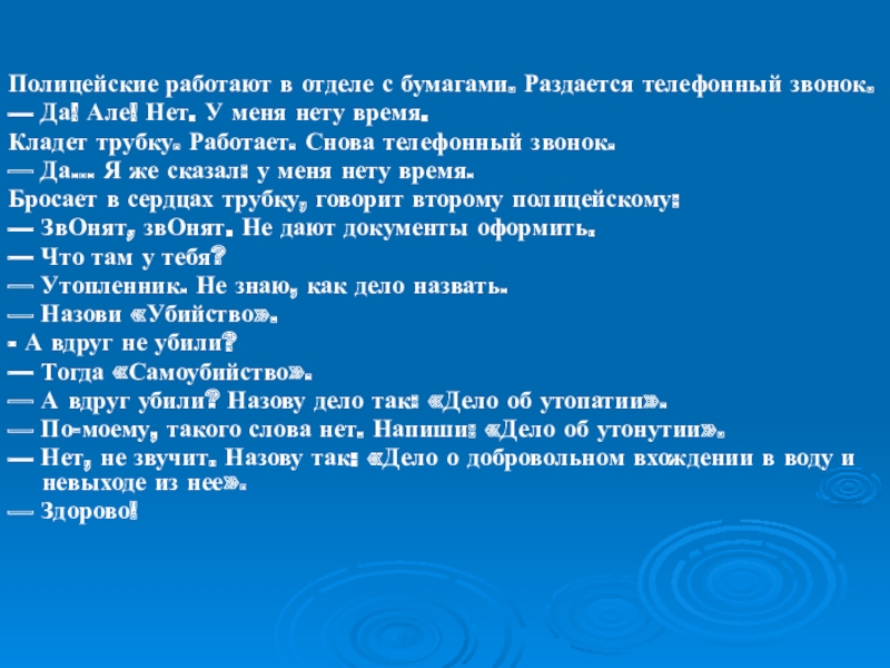 — Нет, не звучит. Назову так: «Дело о добровольном вхождении в воду и невыходе из нее».