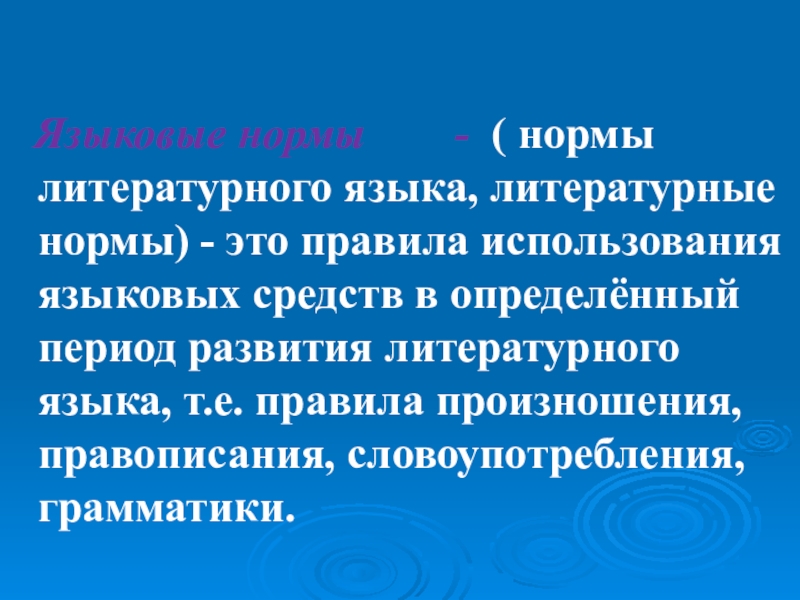 языка, литературные нормы) - это правила использования языковых средств в определённый период развития литературного языка, т.е. правила произношения, правописания, словоупотребления, грамматики.
