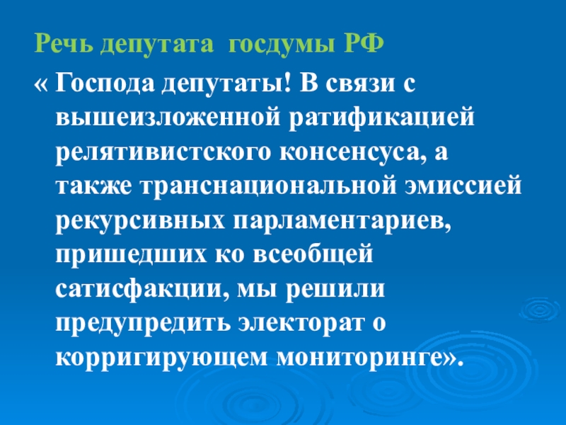 релятивистского консенсуса, а также транснациональной эмиссией рекурсивных парламентариев, пришедших ко всеобщей сатисфакции, мы решили предупредить электорат о корригирующем мониторинге».