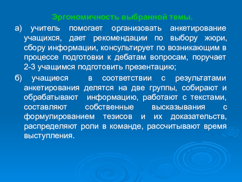 б) учащиеся в соответствии с результатами анкетирования делятся на две группы, собирают и обрабатывают информацию, работают с текстами, составляют собственные высказывания с формулированием тезисов и их доказательств, распределяют роли в команде, рассчитывают время выступления.