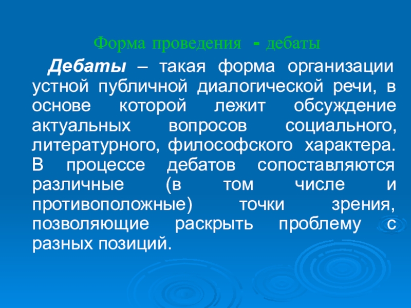 публичной диалогической речи, в основе которой лежит обсуждение актуальных вопросов социального, литературного, философского характера. В процессе дебатов сопоставляются различные (в том числе и противоположные) точки зрения, позволяющие раскрыть проблему с разных позиций.