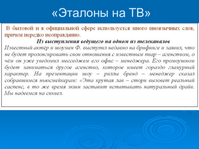 Проанализировать рекламные объявления, выступления дикторов на ТВ, изучение Интернет-языка (подбор материала);