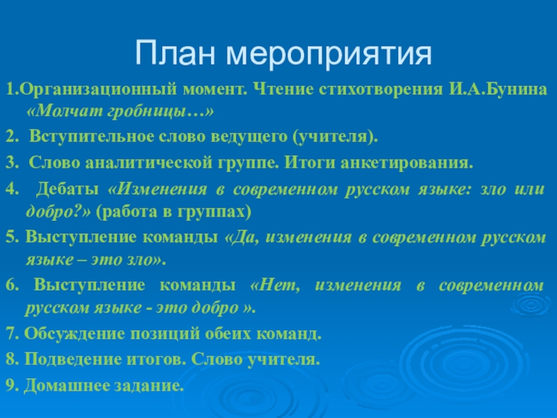 Слайд 14План мероприятия