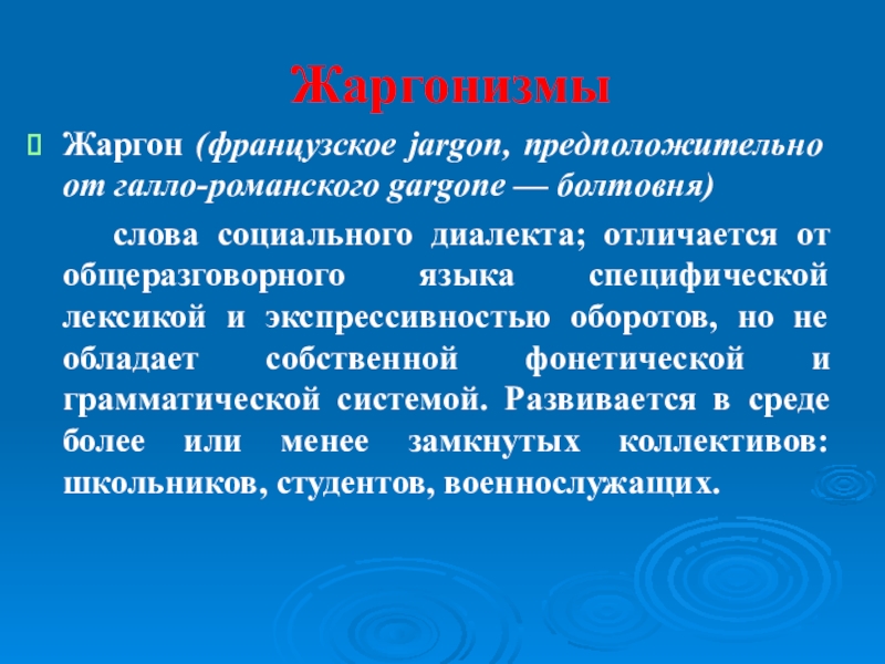 слова социального диалекта; отличается от общеразговорного языка специфической лексикой и экспрессивностью оборотов, но не обладает собственной фонетической и грамматической системой. Развивается в среде более или менее замкнутых коллективов: школьников, студентов, военнослужащих.