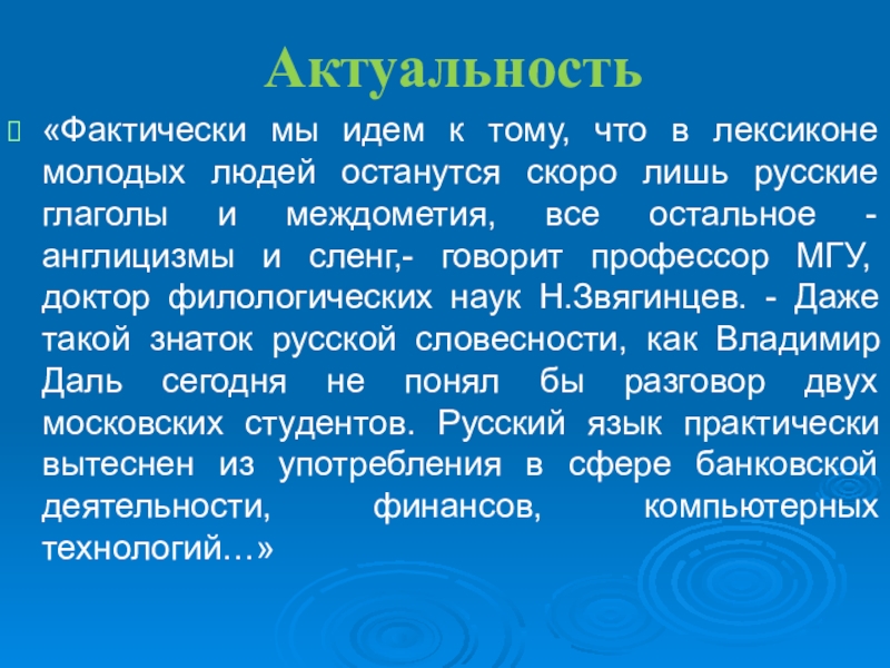 скоро лишь русские глаголы и междометия, все остальное - англицизмы и сленг,- говорит профессор МГУ, доктор филологических наук Н.Звягинцев. - Даже такой знаток русской словесности, как Владимир Даль сегодня не понял бы разговор двух московских студентов. Русский язык практически вытеснен из употребления в сфере банковской деятельности, финансов, компьютерных технологий…»