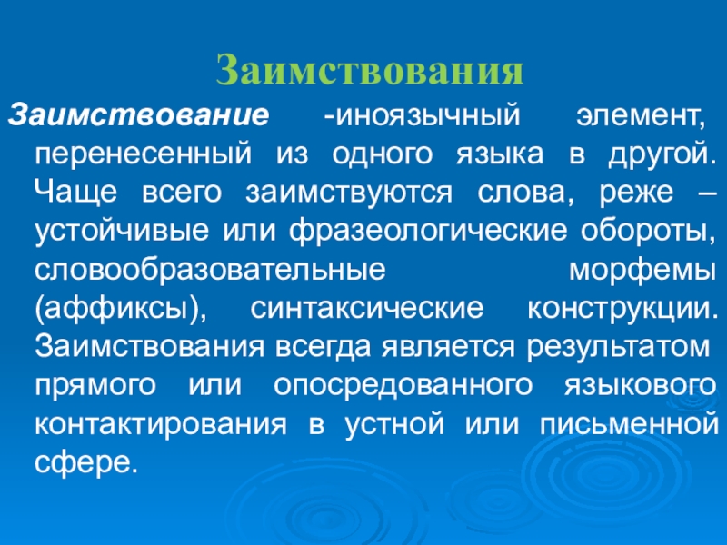 всего заимствуются слова, реже – устойчивые или фразеологические обороты, словообразовательные морфемы (аффиксы), синтаксические конструкции. Заимствования всегда является результатом прямого или опосредованного языкового контактирования в устной или письменной сфере.