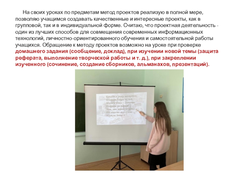 в полной мере, позволяю учащимся создавать качественные и интересные проекты, как в групповой, так и в индивидуальной форме. Считаю, что проектная деятельность - один из лучших способов для совмещения современных информационных технологий, личностно-ориентированного обучения и самостоятельной работы учащихся. Обращение к методу проектов возможно на уроке при проверке домашнего задания (сообщение, доклад), при изучении новой темы (защита реферата, выполнение творческой работы и т. д.), при закреплении изученного (сочинение, создание сборников, альманахов, презентаций).