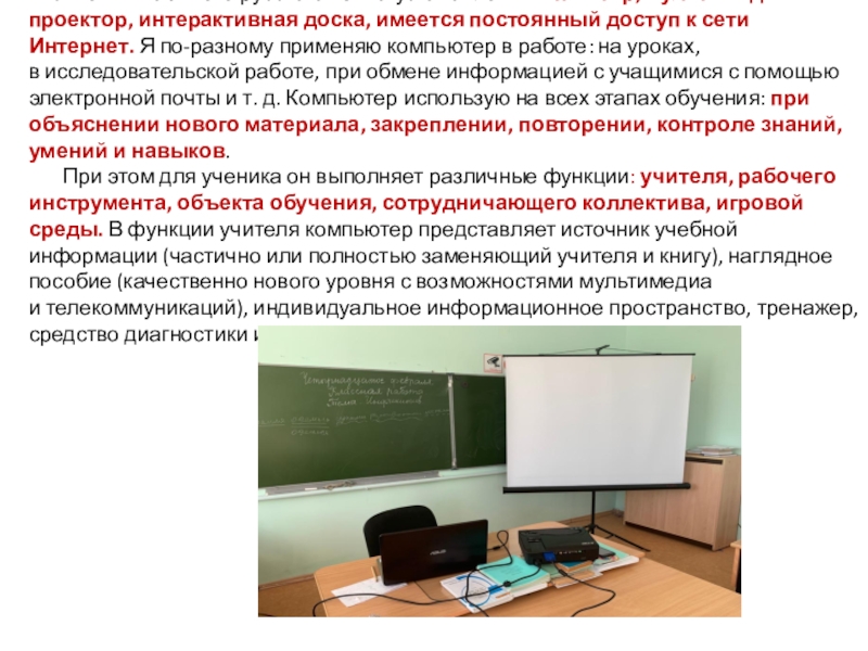 интерактивная доска, имеется постоянный доступ к сети Интернет. Я по-разному применяю компьютер в работе: на уроках, в исследовательской работе, при обмене информацией с учащимися с помощью электронной почты и т. д. Компьютер использую на всех этапах обучения: при объяснении нового материала, закреплении, повторении, контроле знаний, умений и навыков.