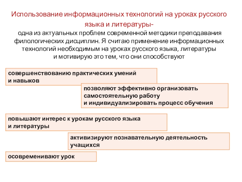 из актуальных проблем современной методики преподавания филологических дисциплин. Я считаю применение информационных технологий необходимым на уроках русского языка, литературы и мотивирую это тем, что они способствуют