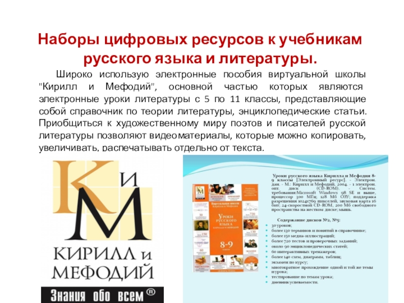 использую электронные пособия виртуальной школы "Кирилл и Мефодий", основной частью которых являются электронные уроки литературы с 5 по 11 классы, представляющие собой справочник по теории литературы, энциклопедические статьи. Приобщиться к художественному миру поэтов и писателей русской литературы позволяют видеоматериалы, которые можно копировать, увеличивать, распечатывать отдельно от текста.