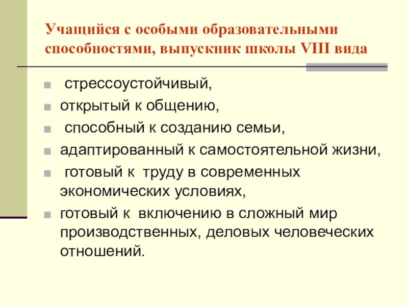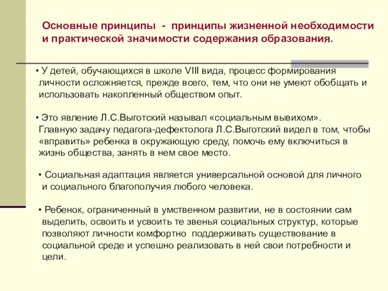 Ребенок, ограниченный в умственном развитии, не в состоянии сам выделить, освоить и усвоить те звенья социальных структур, которые позволяют личности комфортно поддерживать существование в социальной среде и успешно реализовать в ней свои потребности и цели.