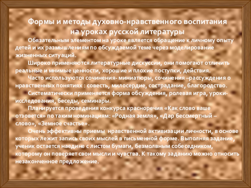 Очень эффективны приемы нравственной активизации личности, в основе которых лежит запись своих мыслей в письменной форме. Выполняя задание, ученик остается наедине с листом бумаги, безмолвным собеседником, которому он поверяет свои мысли и чувства. К такому заданию можно относить незаконченное предложение.