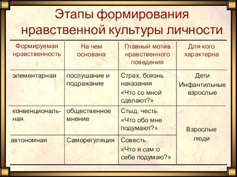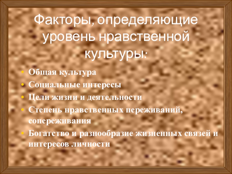 Слайд 7Факторы, определяющие уровень нравственной культуры: