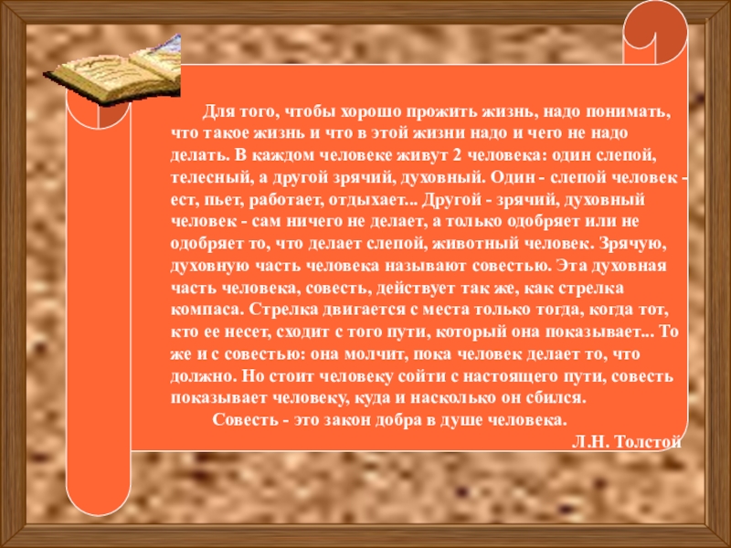 понимать, что такое жизнь и что в этой жизни надо и чего не надо делать. В каждом человеке живут 2 человека: один слепой, телесный, а другой зрячий, духовный. Один - слепой человек - ест, пьет, работает, отдыхает... Другой - зрячий, духовный человек - сам ничего не делает, а только одобряет или не одобряет то, что делает слепой, животный человек. Зрячую, духовную часть человека называют совестью. Эта духовная часть человека, совесть, действует так же, как стрелка компаса. Стрелка двигается с места только тогда, когда тот, кто ее несет, сходит с того пути, который она показывает... То же и с совестью: она молчит, пока человек делает то, что должно. Но стоит человеку сойти с настоящего пути, совесть показывает человеку, куда и насколько он сбился.