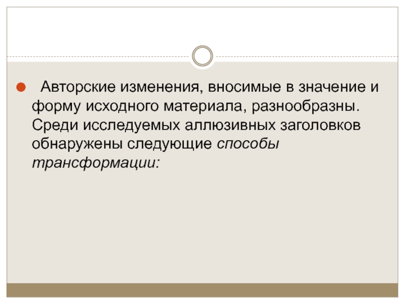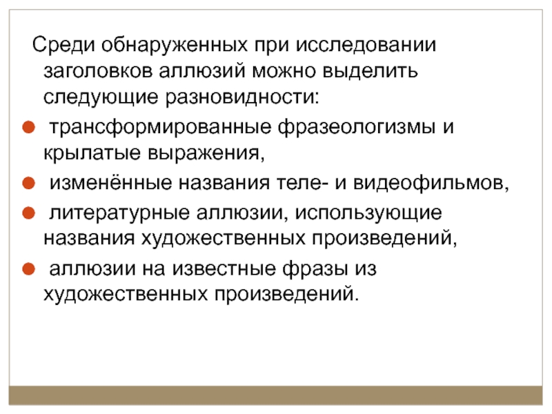 Слайд 8 Среди обнаруженных при исследовании заголовков аллюзий можно выделить следующие разновидности: