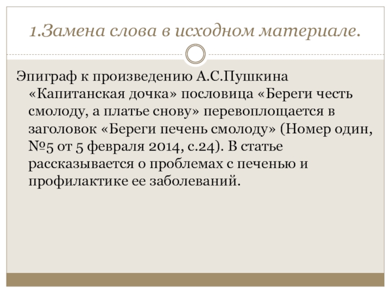 «Береги честь смолоду, а платье снову» перевоплощается в заголовок «Береги печень смолоду» (Номер один, №5 от 5 февраля 2014, с.24). В статье рассказывается о проблемах с печенью и профилактике ее заболеваний.