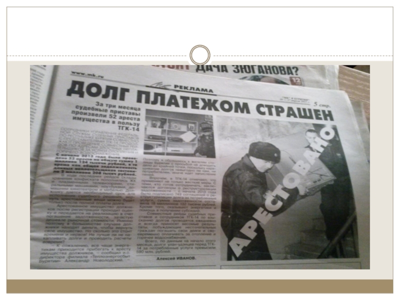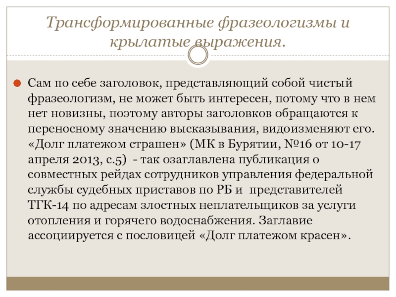 чистый фразеологизм, не может быть интересен, потому что в нем нет новизны, поэтому авторы заголовков обращаются к переносному значению высказывания, видоизменяют его. «Долг платежом страшен» (МК в Бурятии, №16 от 10-17 апреля 2013, с.5) - так озаглавлена публикация о совместных рейдах сотрудников управления федеральной службы судебных приставов по РБ и представителей ТГК-14 по адресам злостных неплательщиков за услуги отопления и горячего водоснабжения. Заглавие ассоциируется с пословицей «Долг платежом красен».