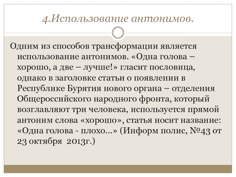 Одним из способов трансформации является использование антонимов. «Одна голова –