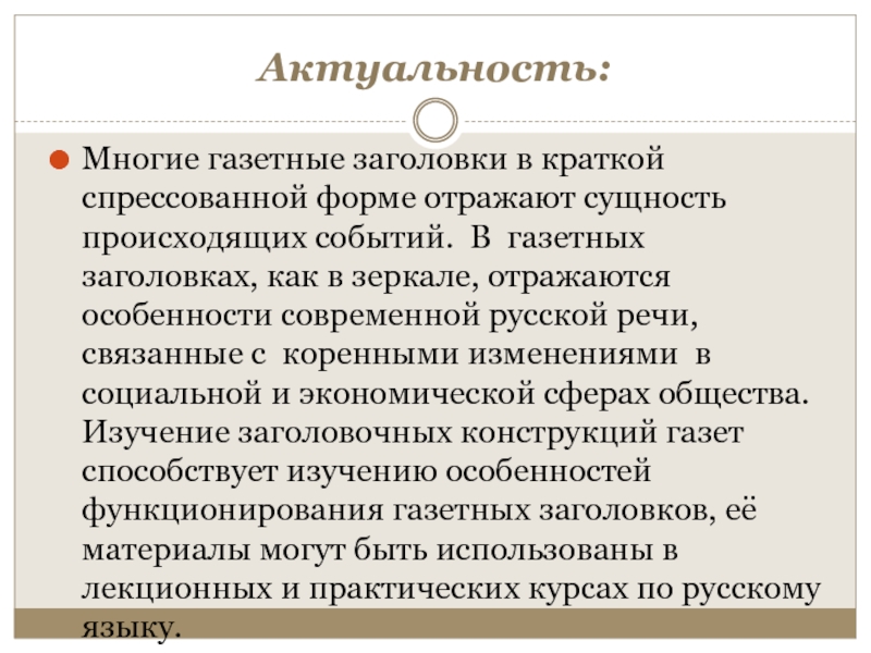 событий. В газетных заголовках, как в зеркале, отражаются особенности современной русской речи, связанные с коренными изменениями в социальной и экономической сферах общества. Изучение заголовочных конструкций газет способствует изучению особенностей функционирования газетных заголовков, её материалы могут быть использованы в лекционных и практических курсах по русскому языку.