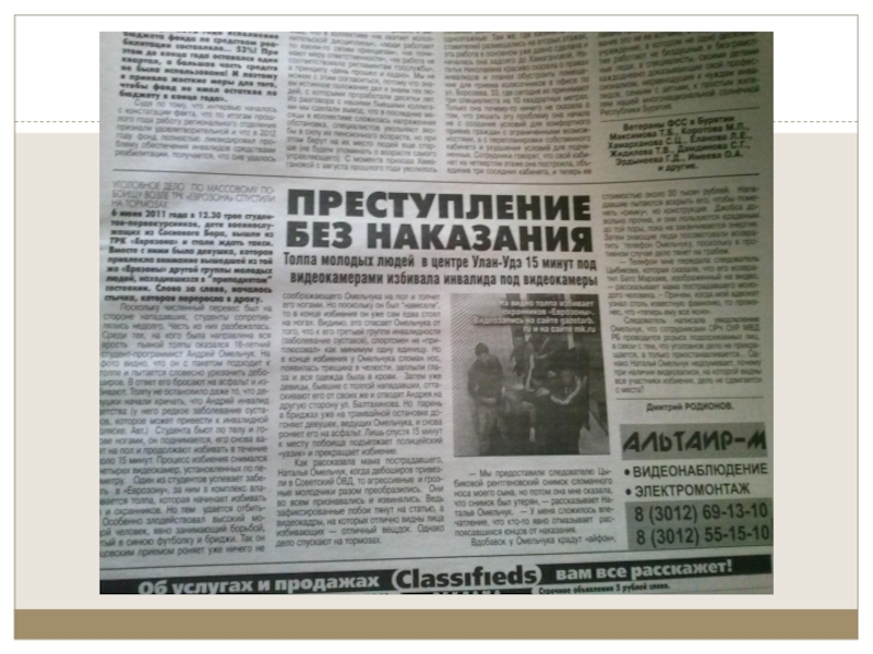газет «Номер один», «Информ полис», «МК в Бурятии», «Традиция» за 2013-2014 годы.