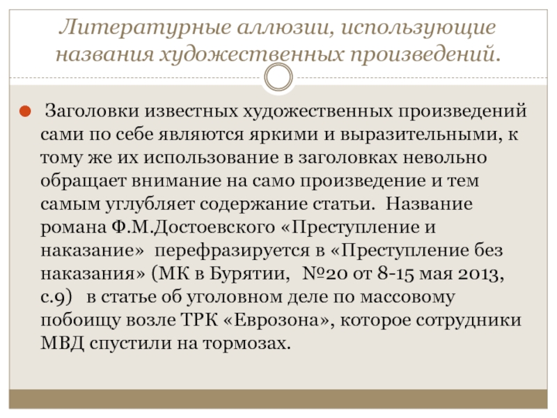 сами по себе являются яркими и выразительными, к тому же их использование в заголовках невольно обращает внимание на само произведение и тем самым углубляет содержание статьи. Название романа Ф.М.Достоевского «Преступление и наказание» перефразируется в «Преступление без наказания» (МК в Бурятии, №20 от 8-15 мая 2013, с.9) в статье об уголовном деле по массовому побоищу возле ТРК «Еврозона», которое сотрудники МВД спустили на тормозах.