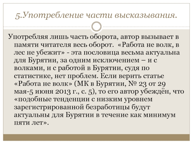 весь оборот. «Работа не волк, в лес не убежит» - эта пословица весьма актуальна для Бурятии, за одним исключением – и с волками, и с работой в Бурятии, судя по статистике, нет проблем. Если верить статье «Работа не волк» (МК в Бурятии, № 23 от 29 мая-5 июня 2013 г., с. 5), то его автор убеждён, что «подобные тенденции с низким уровнем зарегистрированной безработицы будут актуальны для Бурятии в течение как минимум пяти лет».