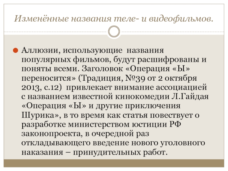 расшифрованы и поняты всеми. Заголовок «Операция «Ы» переносится» (Традиция, №39 от 2 октября 2013, с.12) привлекает внимание ассоциацией с названием известной кинокомедии Л.Гайдая «Операция «Ы» и другие приключения Шурика», в то время как статья повествует о разработке министерством юстиции РФ законопроекта, в очередной раз откладывающего введение нового уголовного наказания – принудительных работ.