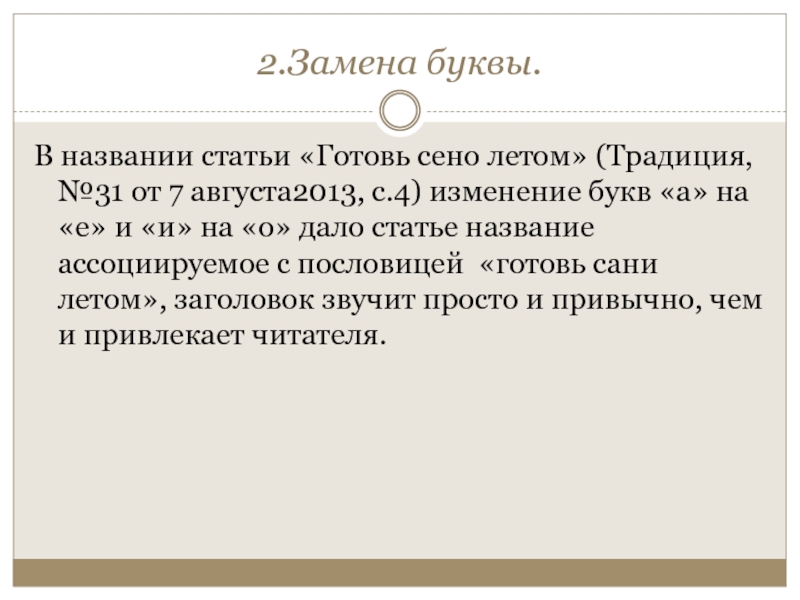 августа2013, с.4) изменение букв «а» на «е» и «и» на «о» дало статье название ассоциируемое с пословицей «готовь сани летом», заголовок звучит просто и привычно, чем и привлекает читателя.