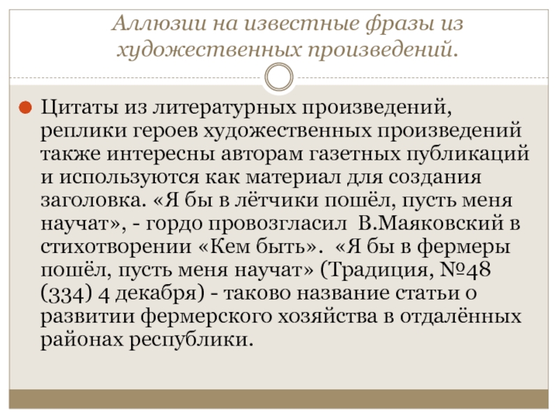 реплики героев художественных произведений также интересны авторам газетных публикаций и используются как материал для создания заголовка. «Я бы в лётчики пошёл, пусть меня научат», - гордо провозгласил В.Маяковский в стихотворении «Кем быть». «Я бы в фермеры пошёл, пусть меня научат» (Традиция, №48 (334) 4 декабря) - таково название статьи о развитии фермерского хозяйства в отдалённых районах республики.