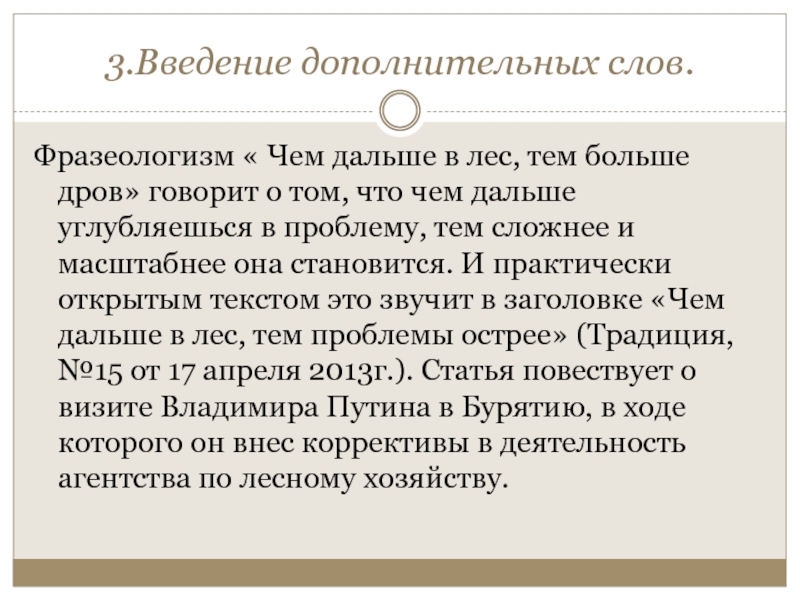 говорит о том, что чем дальше углубляешься в проблему, тем сложнее и масштабнее она становится. И практически открытым текстом это звучит в заголовке «Чем дальше в лес, тем проблемы острее» (Традиция, №15 от 17 апреля 2013г.). Статья повествует о визите Владимира Путина в Бурятию, в ходе которого он внес коррективы в деятельность агентства по лесному хозяйству.