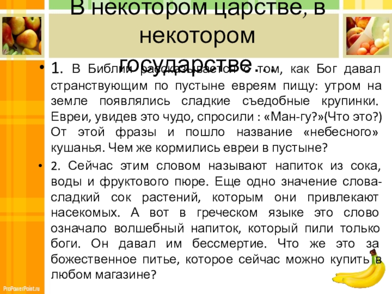 как Бог давал странствующим по пустыне евреям пищу: утром на земле появлялись сладкие съедобные крупинки. Евреи, увидев это чудо, спросили : «Ман-гу?»(Что это?) От этой фразы и пошло название «небесного» кушанья. Чем же кормились евреи в пустыне?