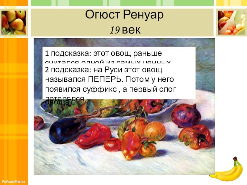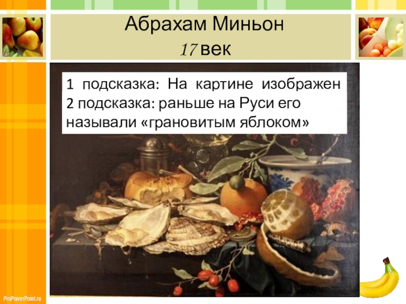 1 подсказка: На картине изображен фрукт, название которого в