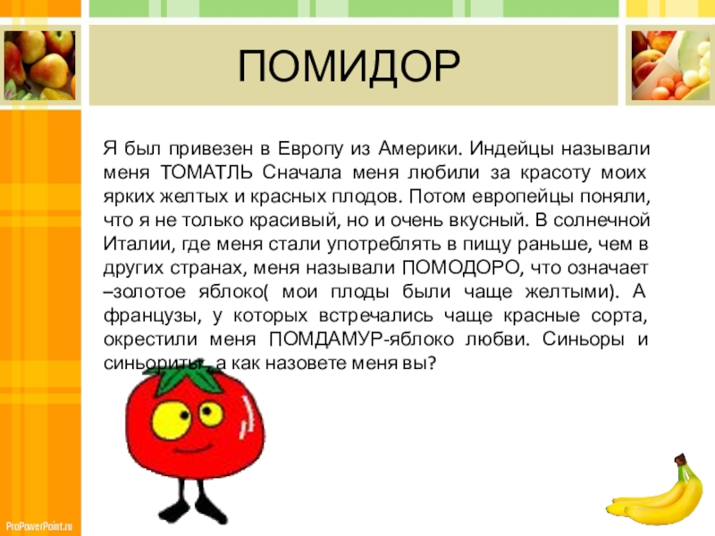 Сначала меня любили за красоту моих ярких желтых и красных плодов. Потом европейцы поняли, что я не только красивый, но и очень вкусный. В солнечной Италии, где меня стали употреблять в пищу раньше, чем в других странах, меня называли ПОМОДОРО, что означает –золотое яблоко( мои плоды были чаще желтыми). А французы, у которых встречались чаще красные сорта, окрестили меня ПОМДАМУР-яблоко любви. Синьоры и синьориты , а как назовете меня вы?