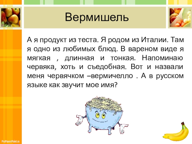 одно из любимых блюд. В вареном виде я мягкая , длинная и тонкая. Напоминаю червяка, хоть и съедобная. Вот и назвали меня червячком –вермичелло . А в русском языке как звучит мое имя?
