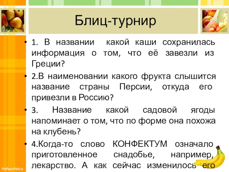2.В наименовании какого фрукта слышится название страны Персии, откуда его привезли в Россию?