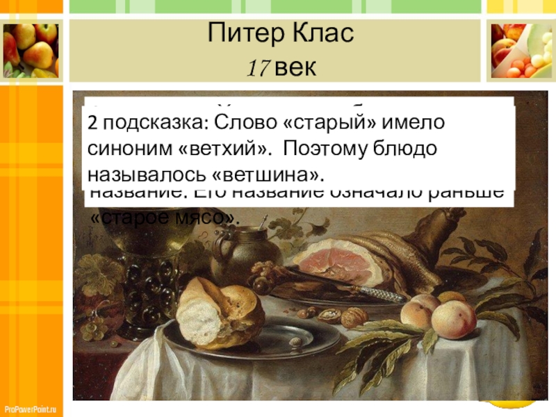 2 подсказка: Слово «старый» имело синоним «ветхий». Поэтому блюдо называлось «ветшина».
