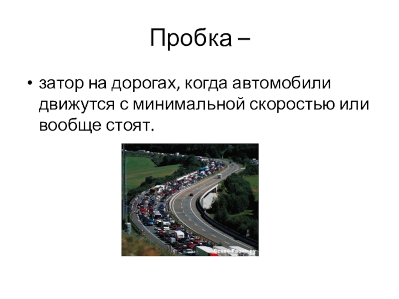 Пробка – затор на дорогах, когда автомобили движутся с минимальной скоростью или вообще стоят.