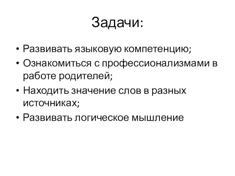 Задачи:Развивать языковую компетенцию;Ознакомиться с профессионализмами в работе родителей;Находить значение слов в разных источниках;Развивать логическое мышление