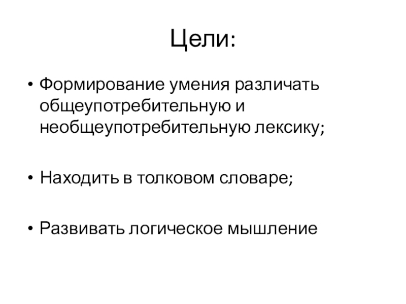 Цели:Формирование умения различать общеупотребительную и необщеупотребительную лексику;Находить в толковом словаре;Развивать логическое мышление