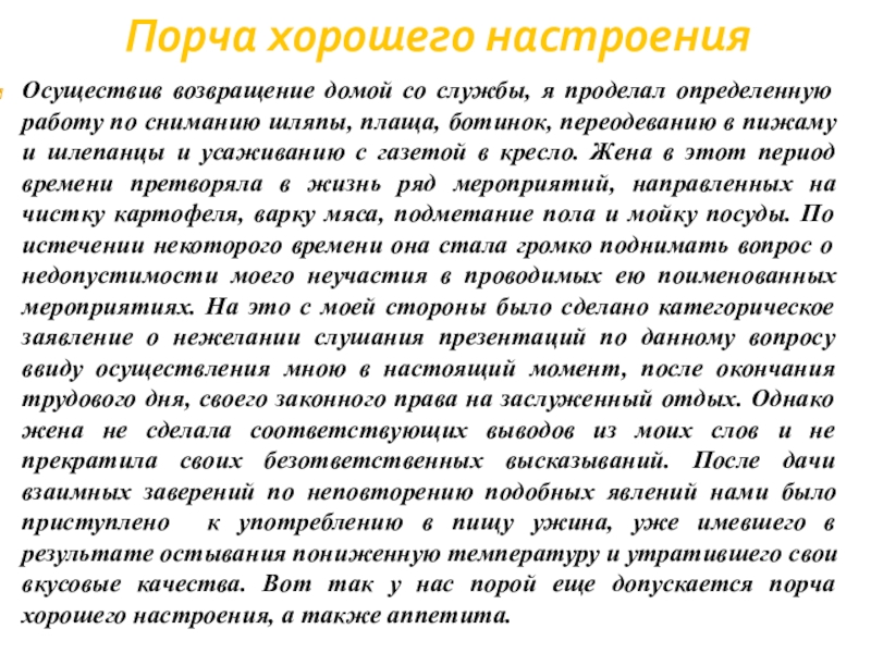 по сниманию шляпы, плаща, ботинок, переодеванию в пижаму и шлепанцы и усаживанию с газетой в кресло. Жена в этот период времени претворяла в жизнь ряд мероприятий, направленных на чистку картофеля, варку мяса, подметание пола и мойку посуды. По истечении некоторого времени она стала громко поднимать вопрос о недопустимости моего неучастия в проводимых ею поименованных мероприятиях. На это с моей стороны было сделано категорическое заявление о нежелании слушания презентаций по данному вопросу ввиду осуществления мною в настоящий момент, после окончания трудового дня, своего законного права на заслуженный отдых. Однако жена не сделала соответствующих выводов из моих слов и не прекратила своих безответственных высказываний. После дачи взаимных заверений по неповторению подобных явлений нами было приступлено к употреблению в пищу ужина, уже имевшего в результате остывания пониженную температуру и утратившего свои вкусовые качества. Вот так у нас порой еще допускается порча хорошего настроения, а также аппетита.
