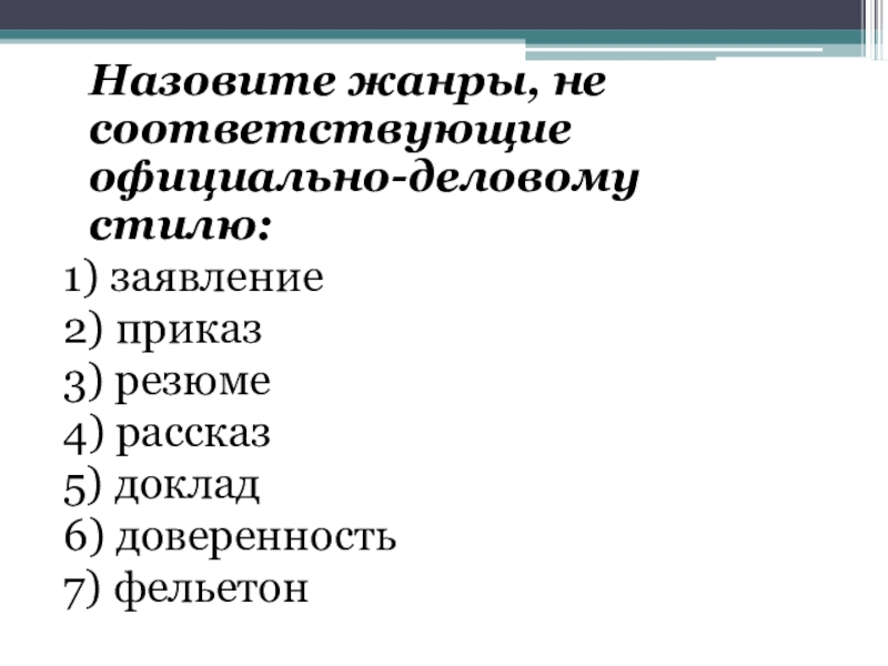 Назовите жанры, не соответствующие официально-деловому стилю: