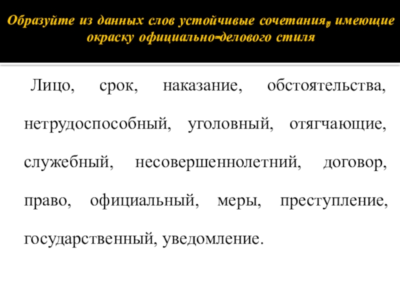 Слайд 18Образуйте из данных слов устойчивые сочетания, имеющие окраску официально-делового стиля