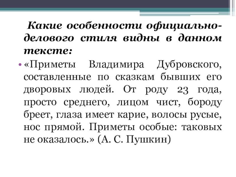 Дубровского, составленные по сказкам бывших его дворовых людей. От роду 23 года, просто среднего, лицом чист, бороду бреет, глаза имеет карие, волосы русые, нос прямой. Приметы особые: таковых не оказалось.» (А. С. Пушкин)