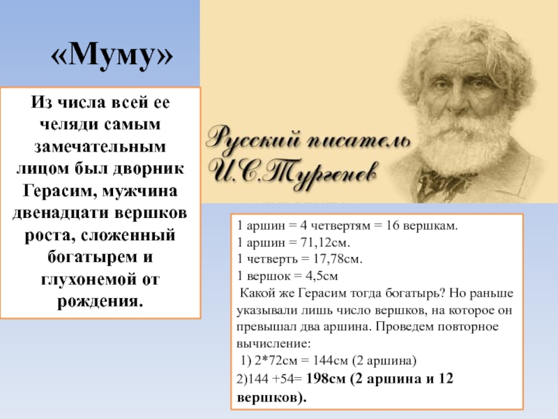 Какой же Герасим тогда богатырь? Но раньше указывали лишь число вершков, на которое он превышал два аршина. Проведем повторное вычисление: