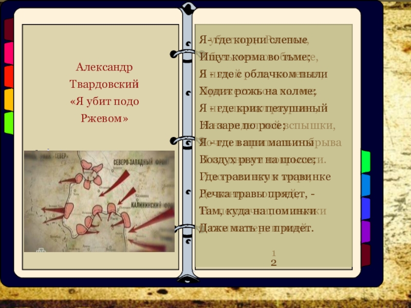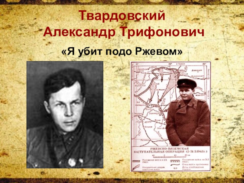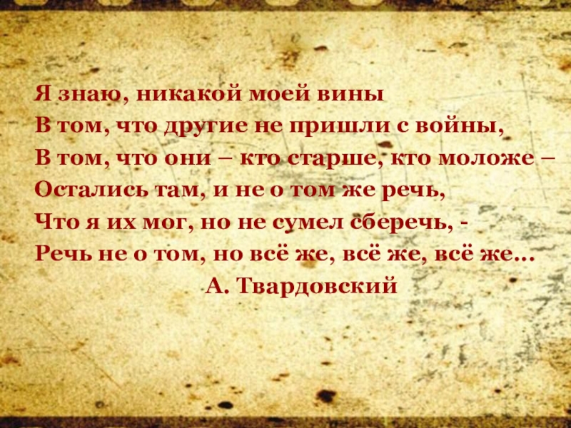 Я убит подо Ржевом, Тот еще под Москвой. Где-то, воины, где вы, Кто остался живой? В городах миллионных, В селах, дома в семье? В боевых гарнизонах На не нашей земле? Ах, своя ли. чужая, Вся в цветах иль в снегу... Я вам жизнь завещаю, - Что я больше могу?