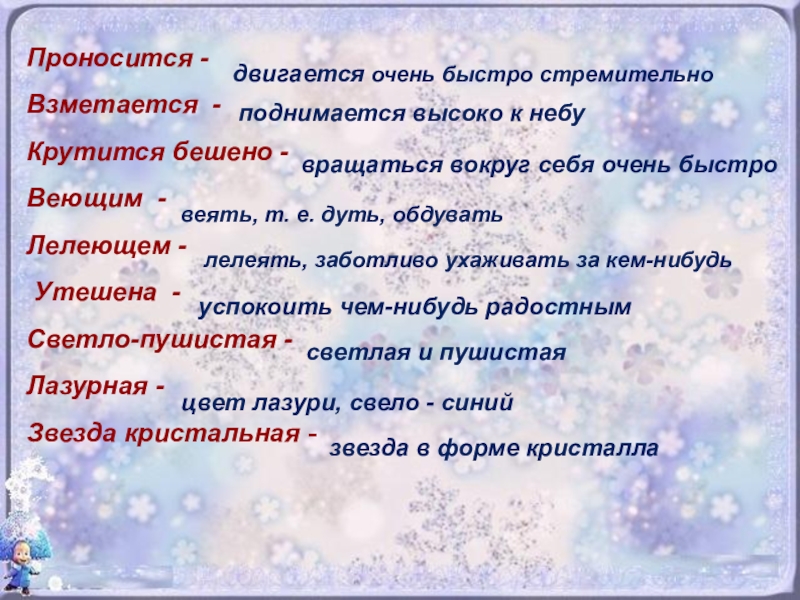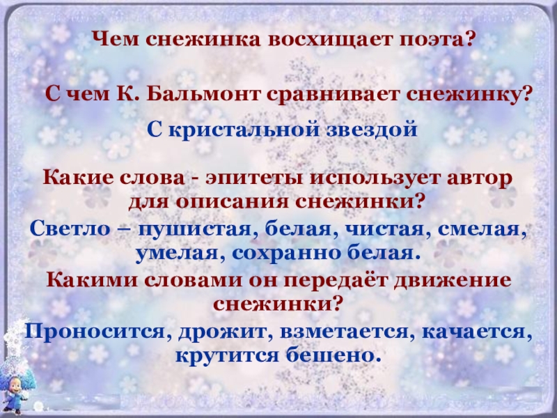 Какими словами он передаёт движение снежинки?