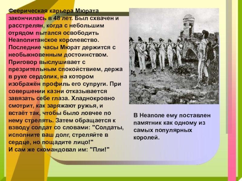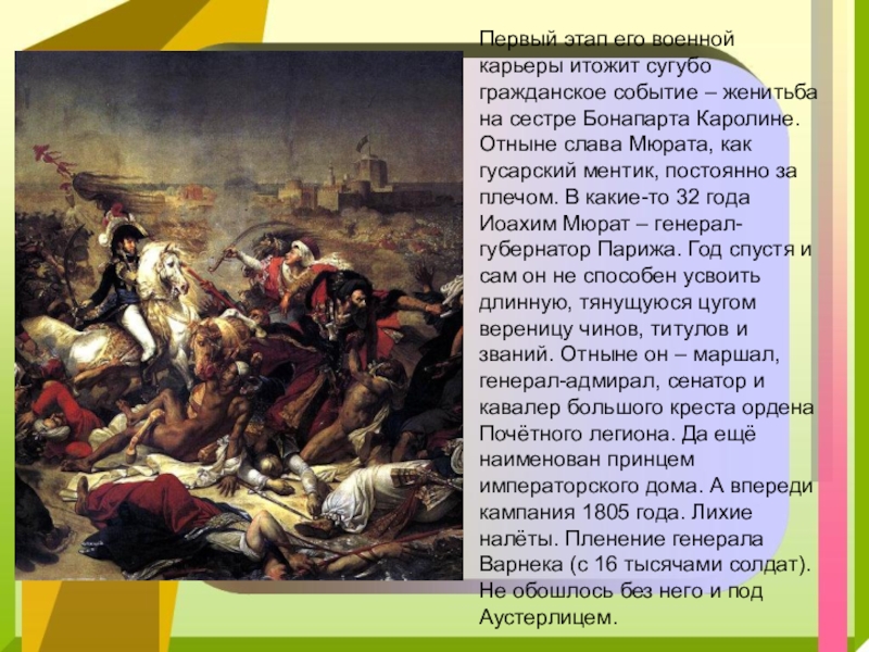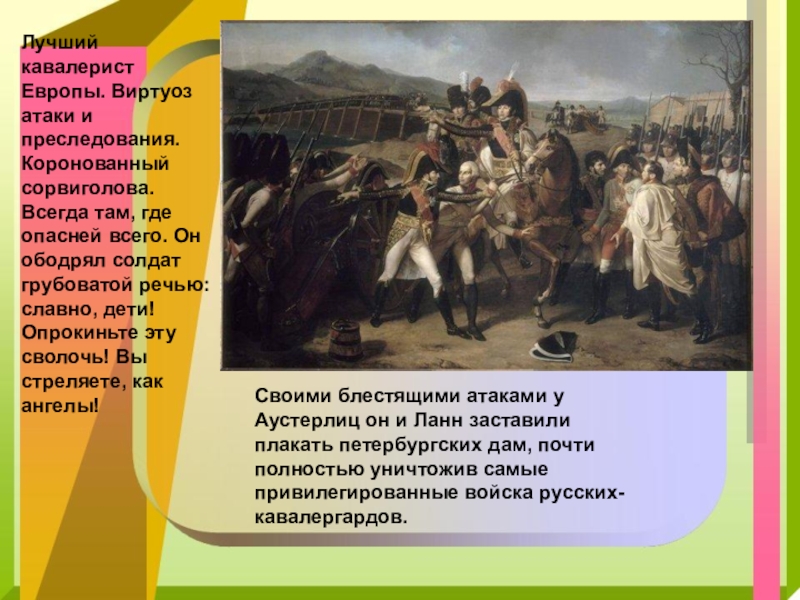 Своими блестящими атаками у Аустерлиц он и Ланн заставили плакать петербургских дам, почти полностью уничтожив самые привилегированные войска русских-кавалергардов.